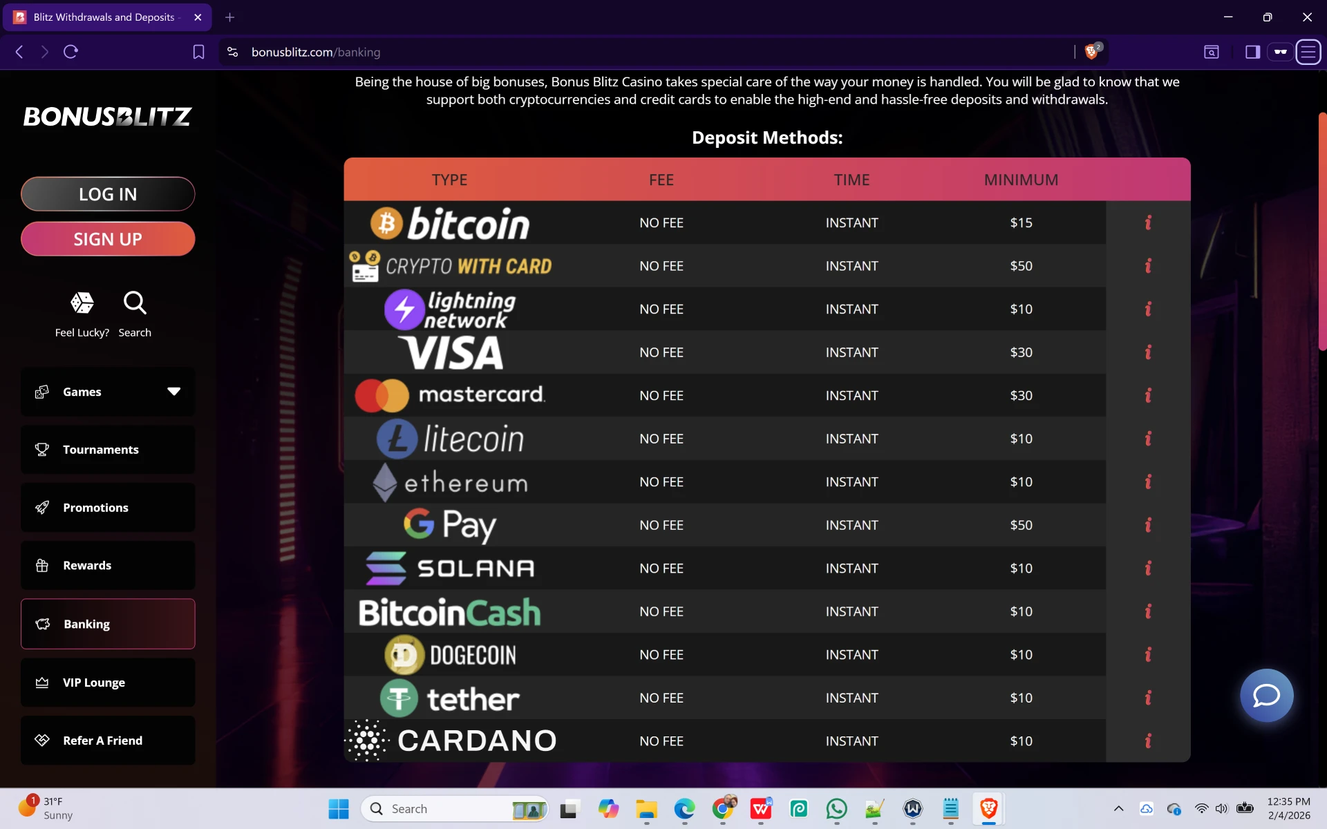 Our team manually tested Bonus Blitz Casino on February 4th, 2026, to verify that their $10 minimum deposit options are still in effect. Below is the step-by-step proof of our successful redemptions.