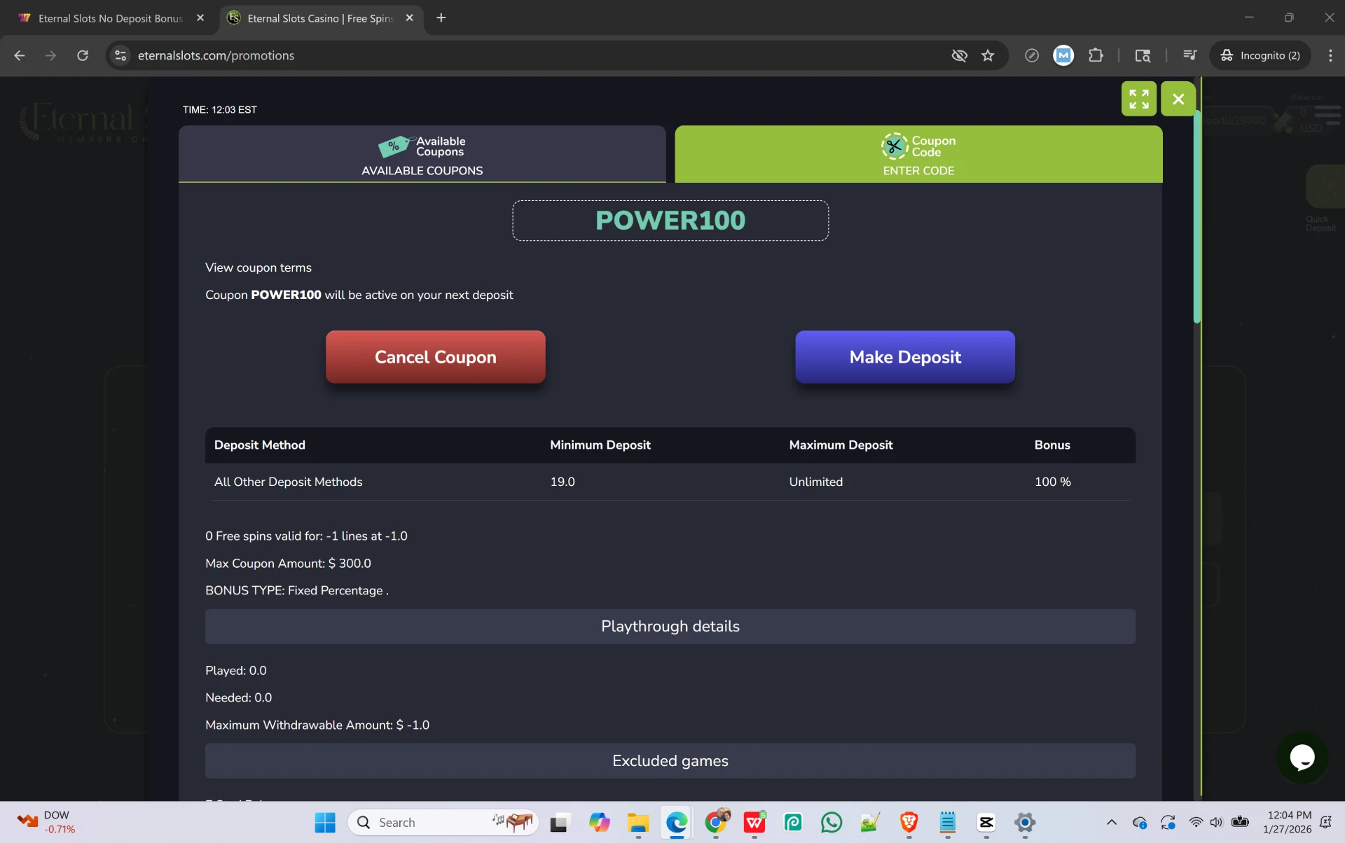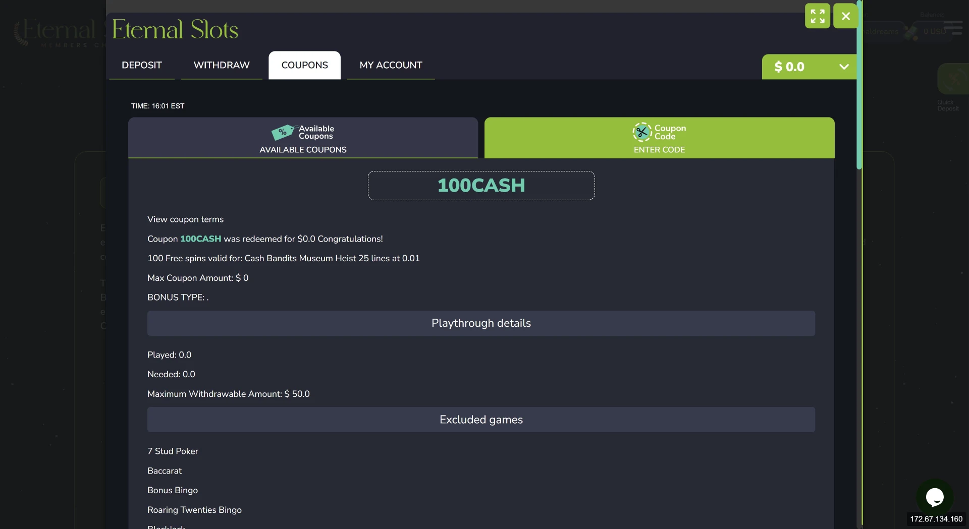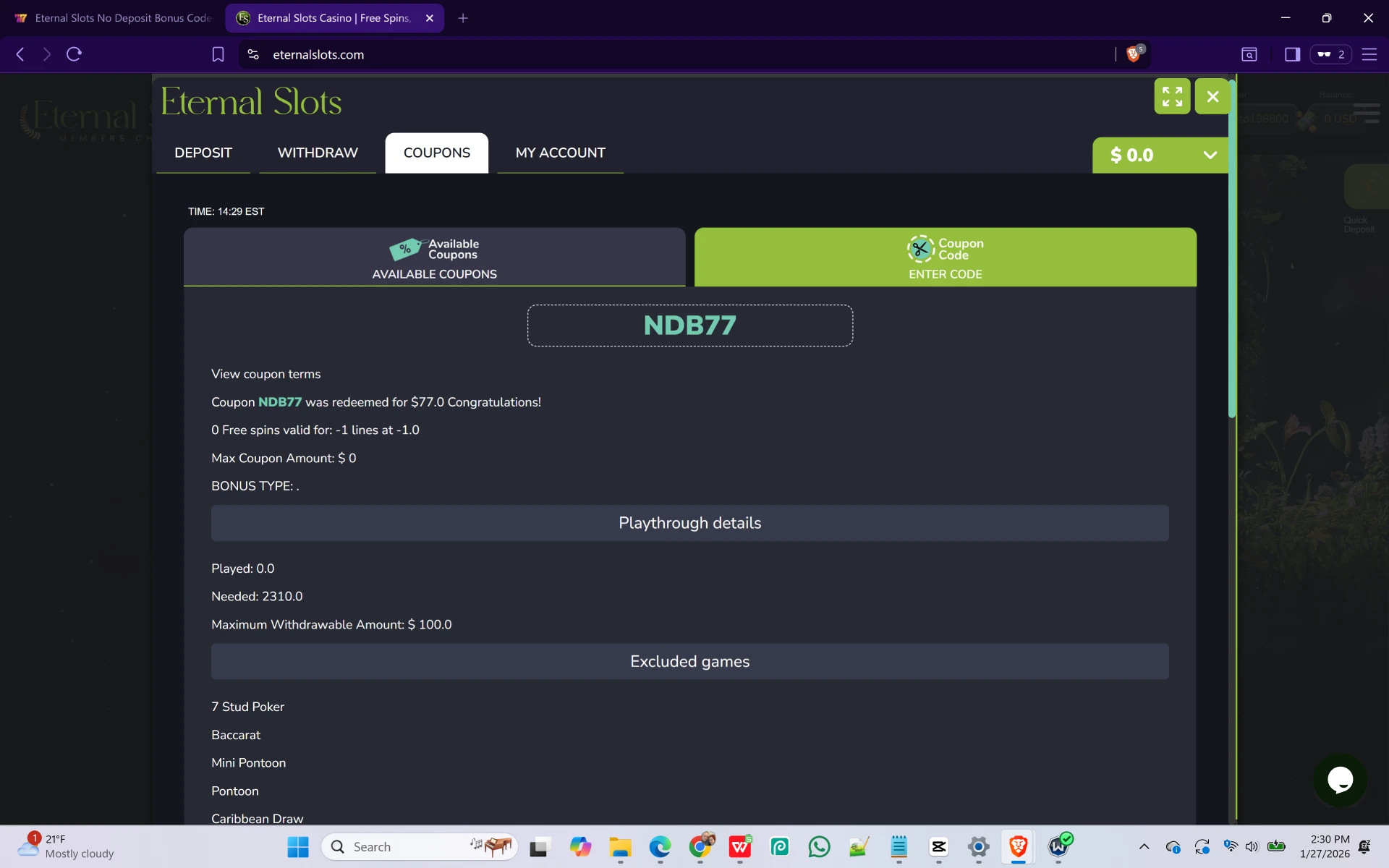 Our team manually tested Eternal Slots on January 29th, 2026, to verify that their $10 minimum deposit and current promo codes are active. Below is the step-by-step proof of our successful redemptions.