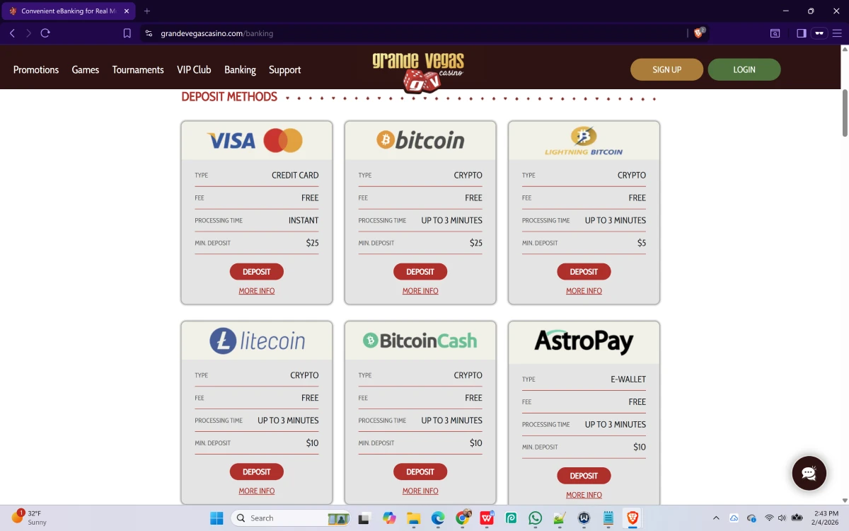 Our team manually tested Grande Vegas on February 4th, 2026, to verify that their $5 minimum deposit and other low deposit options are still in effect. Below is the step-by-step proof of our successful redemptions.