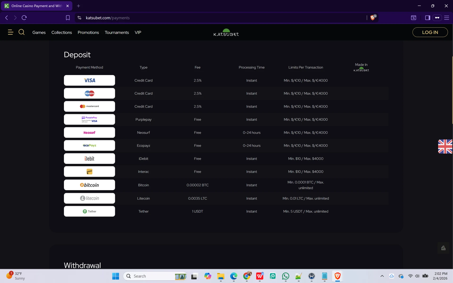 Our team manually tested Katsubet on February 4th, 2026, to verify that their $10 minimum deposit options are still in effect. Below is the step-by-step proof of our successful redemptions.