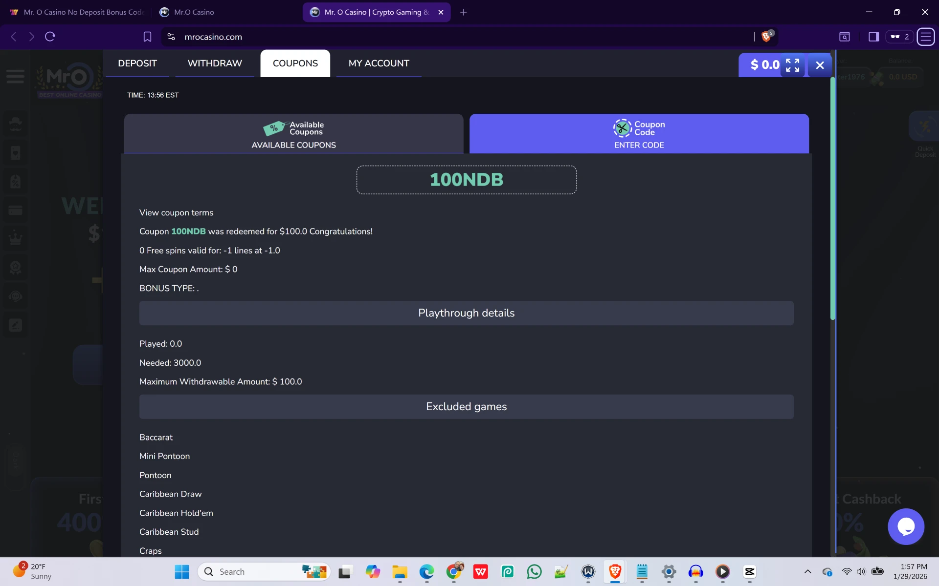 Logged in NDB100 Coupon Redemption