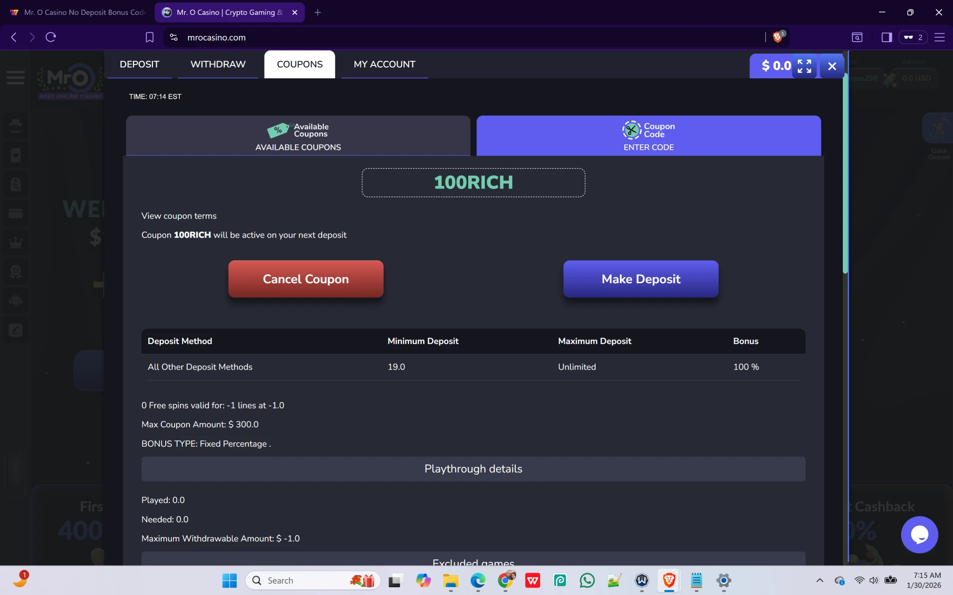 Minimum Deposit & Bonus Code Verification